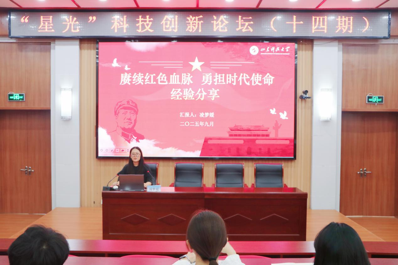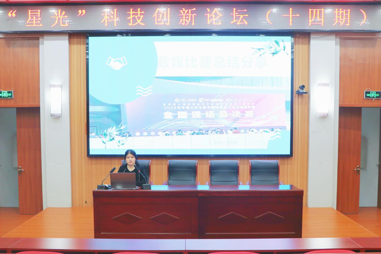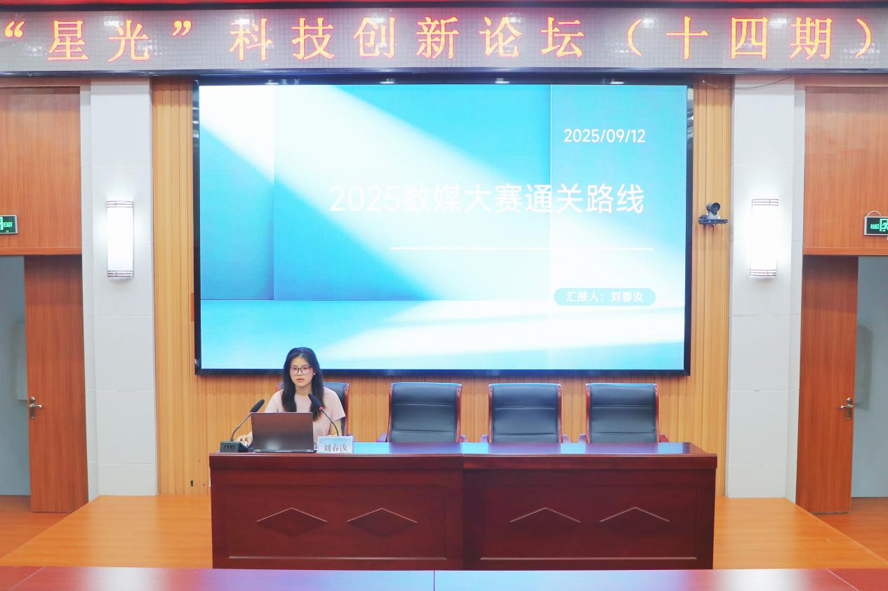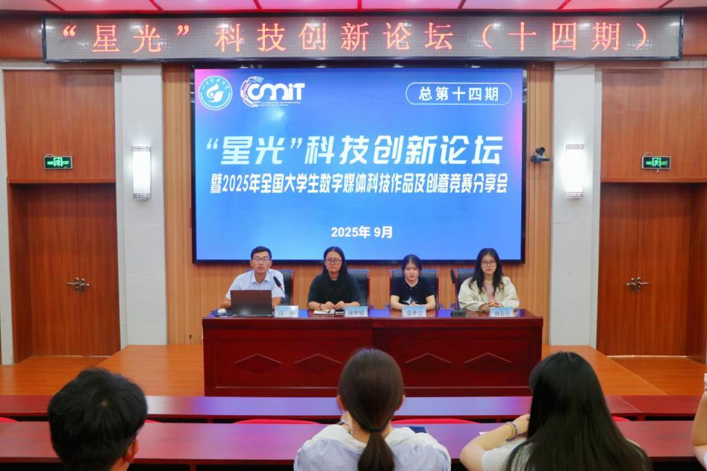 9月12日,第十四期“星光”科技创新论坛暨2025年全国大学生数字媒体科技作品及创意竞赛分享会在西校园八角楼成功举行。本次论坛邀请到2024年国奖获得者张梦萱、刘春汝和凌梦媛三位同学进行经验分享。论坛由校区团委高琳老师主持,校区参赛选手100余人参加活动。