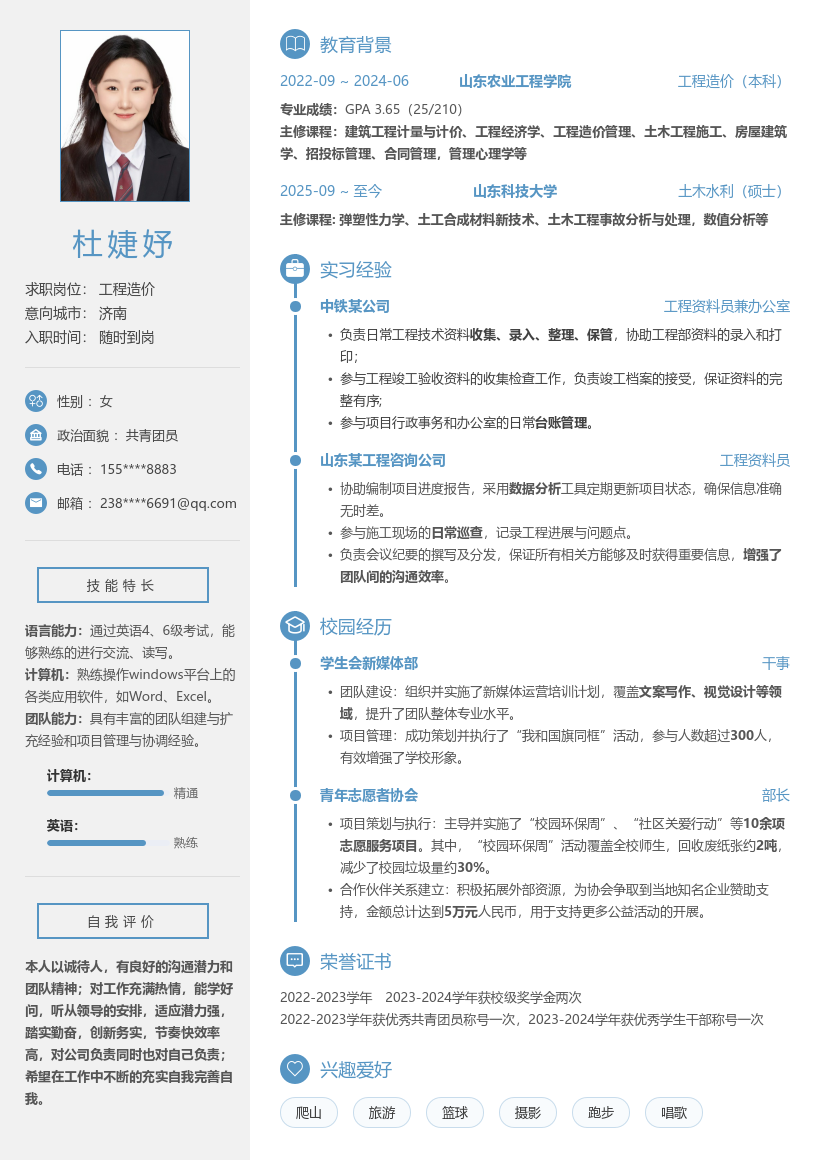 本次大赛面向校区全体在校研究生,参赛选手结合自身专业背景、目标行业与求职意向,围绕基本信息、实践经历、技能特长等核心内容精心制作个人简历,充分展现专业能力、科研素养与职业规划意识。经过评审,资源学院杜婕妤获一等奖;财经学院贺睿琪、智能装备学院石晨获二等奖;资源学院朱俊霖、王海龙,智能装备学院张启磊获三等奖。